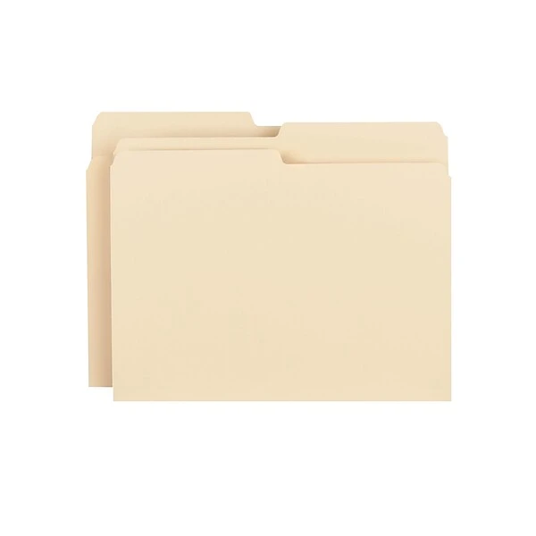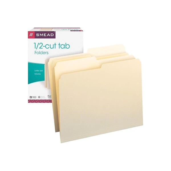 Give your office filing system an upgrade with these file folders. The 1/2-cut single-ply tabs offer ample space for custom subject labels, and the plain design provides space for additional notes on the front and back surfaces. Each folder features sturdy 11-point manila stock construction for long-lasting use. These Smead tabbed file folders accept letter-size documents for versatile document storage options.