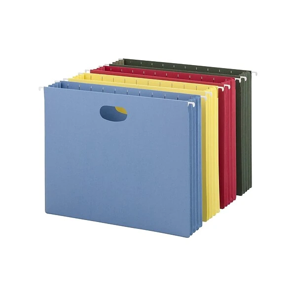 Keep large sets of paperwork together by using these letter-size hanging file pockets. Sold in a pack of 4, these pockets can easily reduce clutter around the office, home, or classroom. These Smead assorted colors hanging file pockets are made with a durable bottom and sides, keeping documents contained and preventing them from slipping out when removing the pocket.