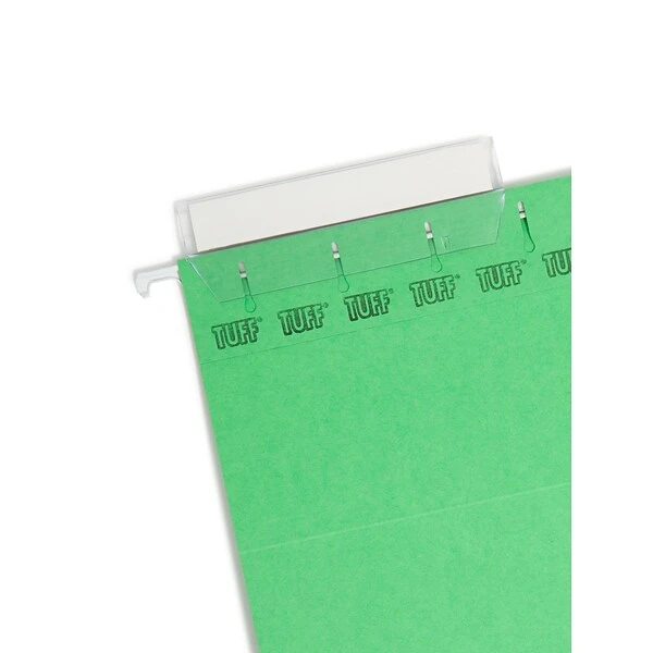 Smead TUFFĀ® Hanging file folder in green color features reinforced steel rod to resist from bending and tearing. Letter size folder includes 1/3-cut heavy-duty oversized tabs and replaceable white tab inserts, sold as 18 per box.
