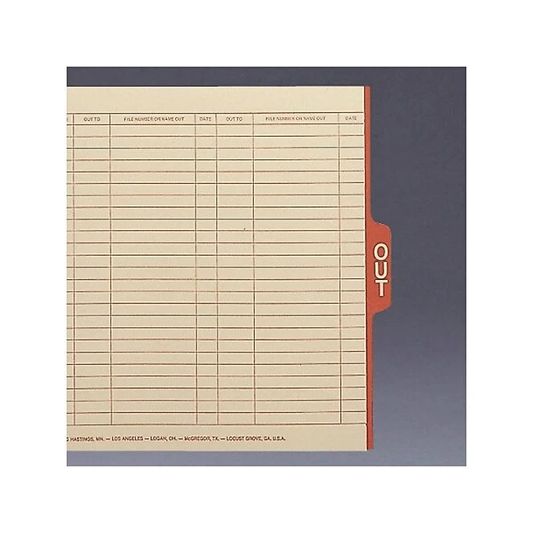 Prevent folders from being misplaced or lost with these end-tab manila outguides. With an included printed form that indicates file and date, these outguides ensure tracking files is simple. These Smead letter-size 1/5-cut center-position tab outguides have a bright red tab, making them stand out for easy location.