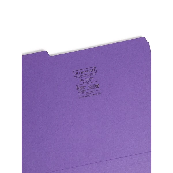 Bring a color-coded component to an office filing system with these purple interior files. The 1/3-cut assorted-position tabs remain visible inside hanging folders for easy organization, and the 11-point stock offers durability to withstand everyday wear and tear. With their simple design, these Smead interior folders work with letter-size hanging file systems for convenient compatibility, and the purple color makes them easy to find.