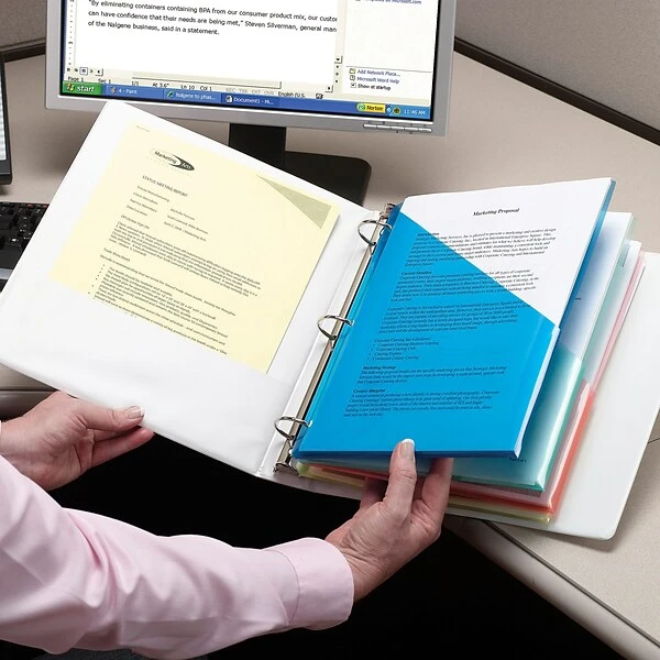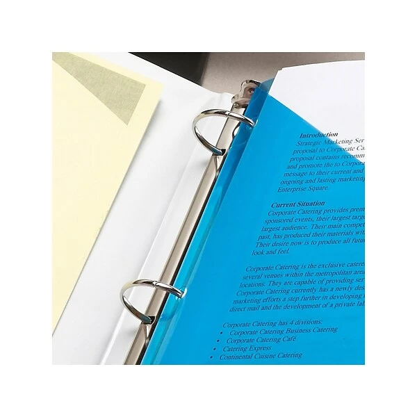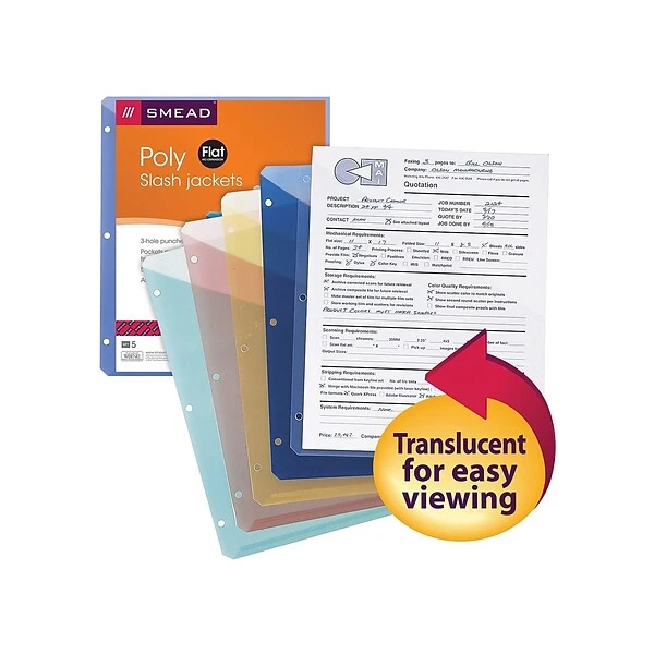 Protect papers from rips, tears, and dirt with these Smead letter-sized translucent pockets. Diagonal slash pockets on both sides keep documents safe and secure while making it easy to pull them out when needed. These Smead translucent binder pockets have a textured surface that cuts down glare, so papers stay easy to read. Put papers into three-ring binders quickly without punching them. Diagonal slash pockets on both sides keep documents safe and sound, and make it easy to pull them out when needed.