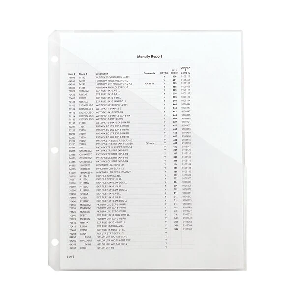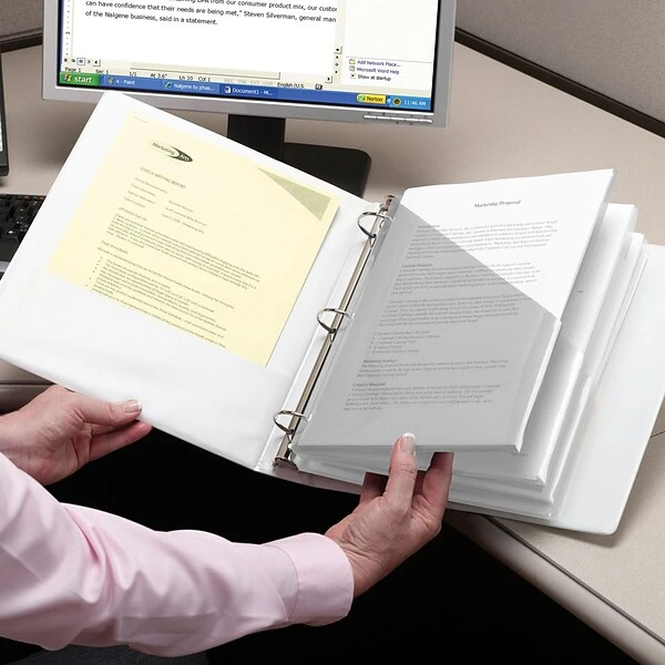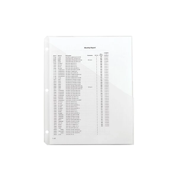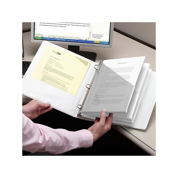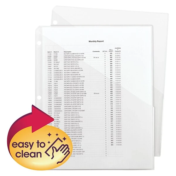 Give presentation documents a sleek finishing touch with these Smead letter-size slash-style pockets. Each sheet features an angled slash design for convenient document loading. The tear-proof, water-resistant construction provides protection against potential damage, while the prepunched edges work with traditional three-ring binders for fast, easy setup. These Smead letter-size slash-style binder pockets boast a clear design to keep documents clearly visible. Put papers into three-ring binders quickly without punching them. Diagonal slash pockets on both sides keep documents safe and sound, and make it easy to pull them out when needed.