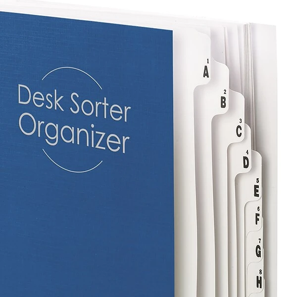 Prevent documents from getting lost with this desk file and sorter. Featuring 20 alphabetical dividers, this sorter makes locating specific papers quick and simple, while the large size allows for the accommodation of both letter-size and legal-size documents for added versatility. This Smead blue desk file and sorter has a book layout, so you can easily flip to the desired page, and is made from durable material, keeping contents protected from rips, spills, and other damage.