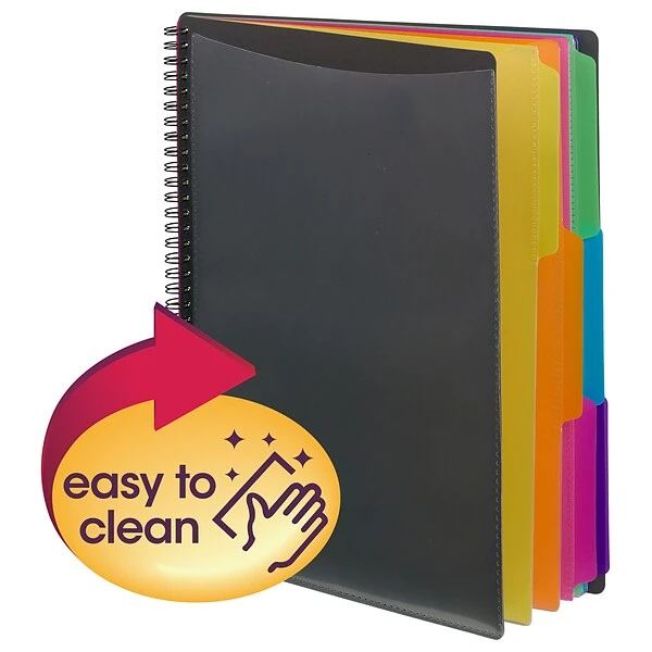 - Durable cover comes in gray with bright-color tabs: fuchsia, neon orange, neon green, neon pink, yellow, and blue