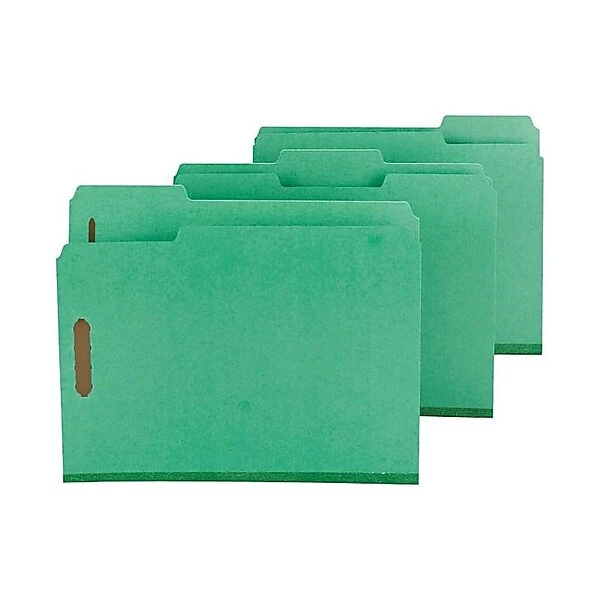 Keep your documents in order with a box of 25 colored fastener folders. Coated SafeSHIELD fasteners protect fingers from paper cuts, while sturdy pressboard keeps documents from tearing and wrinkling. The green color and 1/3 cut tab make these folders stand out for easy recognition and labeling, and the 2-inch expansion on these letter-size Smead folders makes filing a thick stack of forms a breeze.