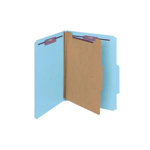Organize and store critical documents with these pressboard classification folders. The SafeSHIELD coated fasteners hold documents in place while preventing finger cuts. A 2/5-cut tab layout provides space for custom labels, and 23-point pressboard construction offers strength and durability for everyday use. With a blue hue, these Smead SafeSHIELD fastener folders make it easy to color-code your files.