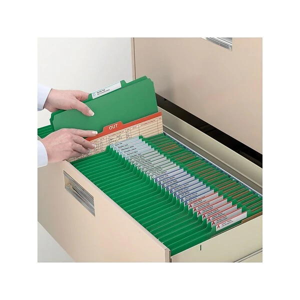 Subdivide complex documents with these letter-size green pressboard fastener folders. The SafeSHIELD fasteners hold documents securely without crinkling and protect against rips and finger cuts, while the sturdy pressboard construction protects contents from the wear of regular use. These Smead SafeSHIELD letter-size pressboard fastener folders come in a box of 10 and have a 2/5-cut tab for placing labels.