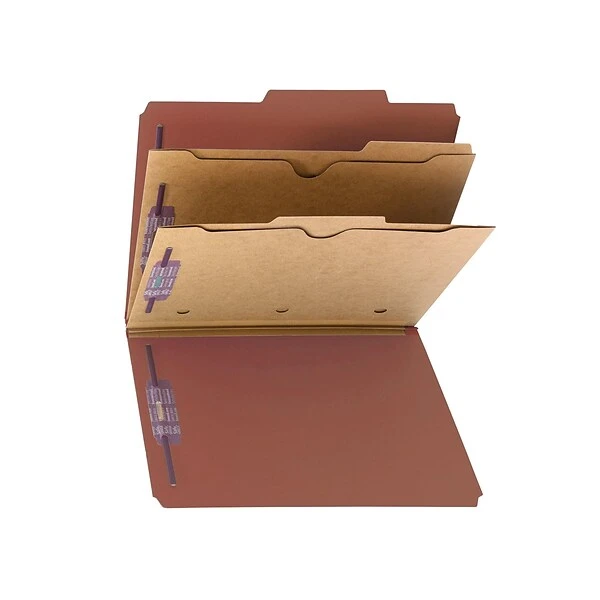 Classify documents into sections with this 10-count box of Smead classification folders. The fasteners on both covers and on the two kraft dividers let you organize paperwork with six filing surfaces, and the durable 25-point red pressboard material protects documents during frequent use and helps with color-coding filing systems. Two pocket-style dividers on these Smead classification folders provide six sections and storage space for loose papers or pamphlets.