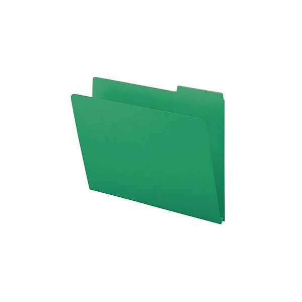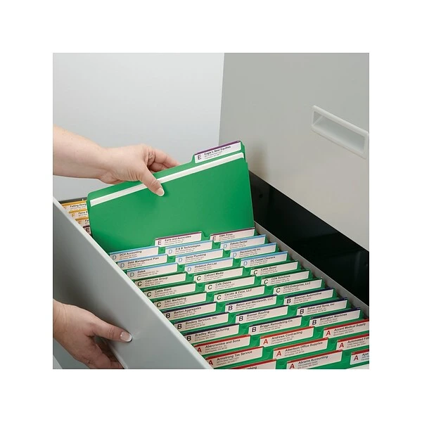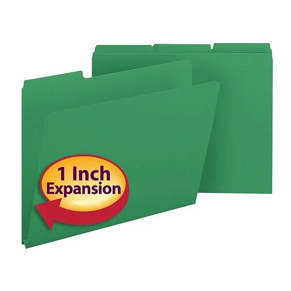 Identify important reports, forms and other paperwork quickly with these green file folders. The tough pressboard construction is sturdy and firm, helping the contents inside stay smooth and protected, while the 1/3-cut tabs allow for easy labeling. These Smead pressboard file folders feature tear-resistant gussets, which expand up to 1″ in width so you can store thick stacks of documents inside.