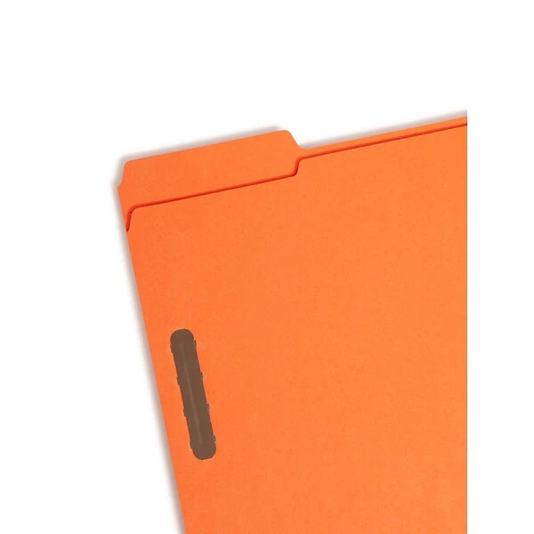 Color-code important files with these orange Smead letter-size file folders. Each interior panel features a fastener to hold paperwork in place, and the reinforced tab design resists damage and wear. The assorted tab position ensures file labels are easy to spot as you flip through your file cabinet drawers. With curved edges, these Smead letter-size file folders resist catching and tearing.