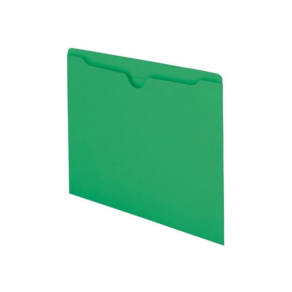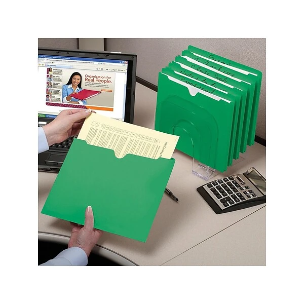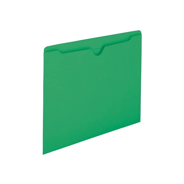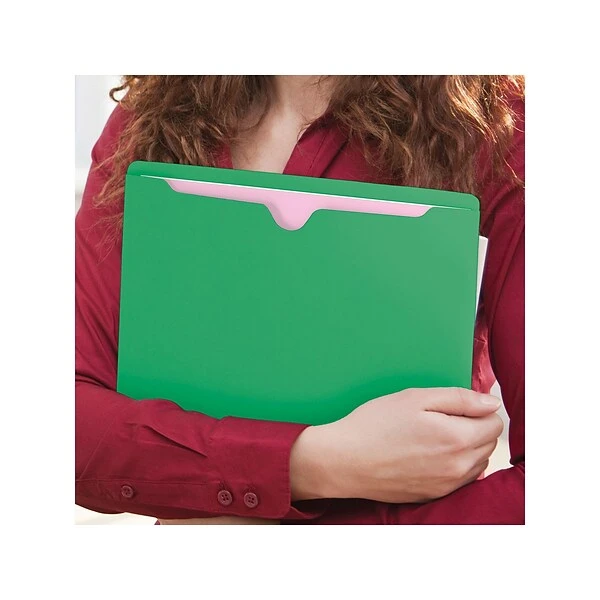 Keep current or high-priority paperwork sorted in these reinforced-tab file jackets. The straight-cut tabs provide convenient space for adding custom labels, while the thumb-cut fronts offer easy access to the photos or documents stored within. A bright green hue makes it easy to color-code papers for easy reference. With three-sided closures, these Smead flat no-expansion file jackets prevent pages from slipping out.
