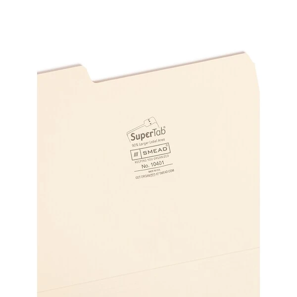 Make filing documents easy with these Smead SuperTab letter-size manila file folders. The oversized 1/3-cut tab layout provides ample room for file names, account numbers and other essential information, while the heavyweight construction is ideal for everyday handling. These Smead SuperTab letter-size manila file folders feature a versatile design that’s ideal for use in vertical or lateral file systems.