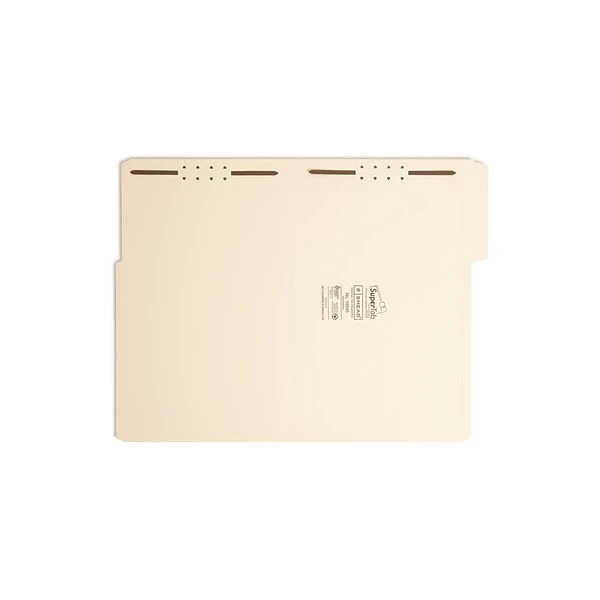 SuperTab® Fastener Folders protect, store, and organize all of your documents so you can find them again easily. Made of 14 point stock, these durable file folders resist wear and tear and stand up to high-traffic use. The SuperTab® oversized labeling area is 90% larger than standard fastener folders. You can use larger text or more lines of description, making it even easier to stay organized. Fasteners hold papers securely inside folders and prevent valuable papers from falling out or getting lost.