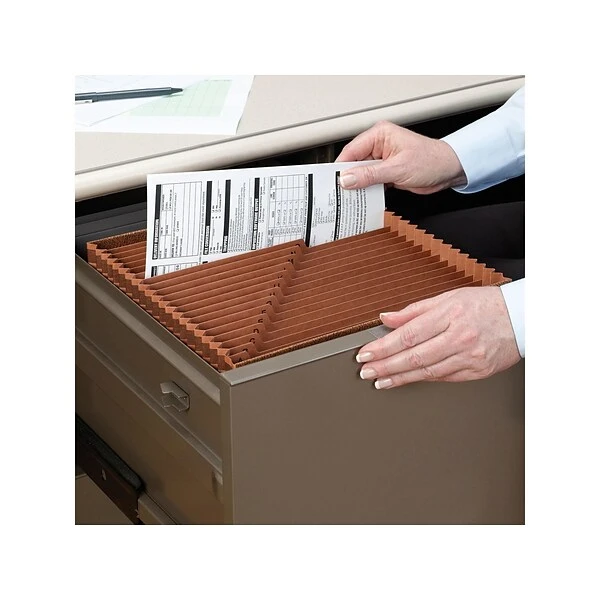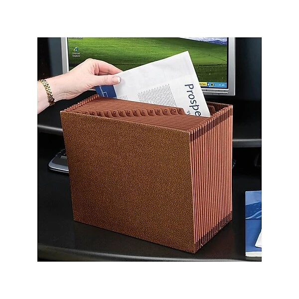 Make important paperwork easier to transport with this expanding file folder. A Tyvek-reinforced gusset at the top and bottom provide strength and durability, while the accordion design allows the amount of paperwork you store to vary based on your needs. An open top makes thumbing through the paperwork easy, and the 21 built-in pockets make this Smead TUFF expanding accordion folder great for organizing information by date, month or letter.