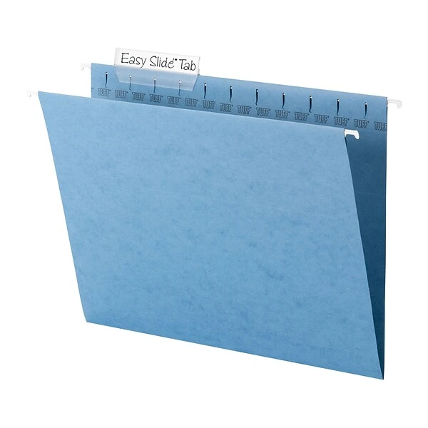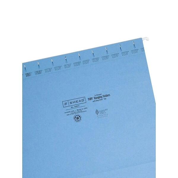 Smead TUFF® Hanging file folder in blue color features reinforced steel rod to resist from bending and tearing. Letter size folder includes 1/3-cut heavy-duty oversized tabs and replaceable white tab inserts, sold as 18 per box.