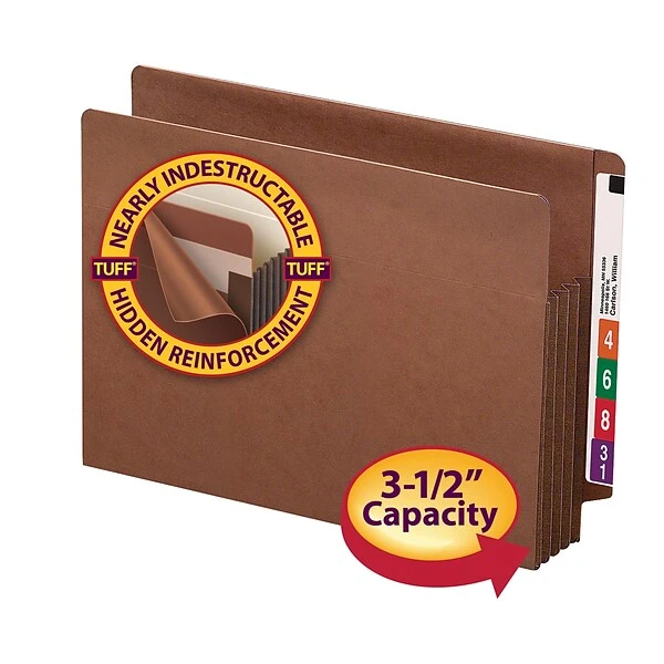 Each Smead TUFF file pocket features fully lined guessets that expand up to 3 1/2 inches. The pockets collapse to conserve space in tight shelves, then easily expand as needed to hold larger files or paper stacks. This wide expansion size makes these pockets suitable for grouping together multiple similar projects or keeping relevant booklets with documents.