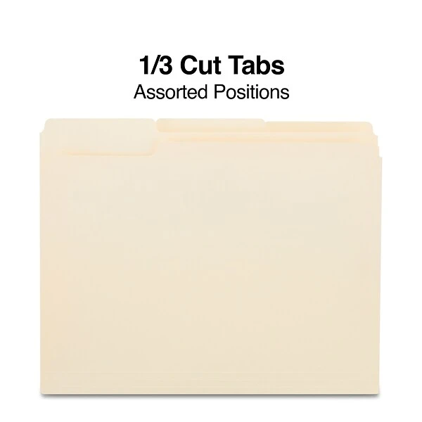Create an efficient filing system with these three-tab manila file folders. Three separate tab positions let you alternate file placement for easy viewing and access. These Staples three-tab letter-size manila file folders feature round corners to prevent tearing and sturdy construction to stand up to daily use.