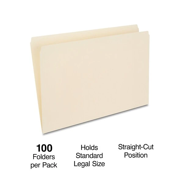 Stock your supply area with these manila file folders. The straight-cut tab design offers ample space for labeling, and the durable heavyweight paper construction withstands regular use. Each folder is sized to fit legal-size documents, protecting important paperwork from damage and loss. With 100 pieces in each box, these Staples single-tab manila file folders provide a smart choice for busy offices.