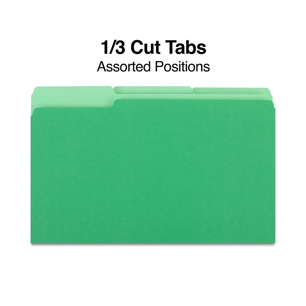 Gather paperwork together for storage in these green file folders. The convenient sizing accommodates legal-size pages, keeping contracts, applications and other long-form documents organized and protected. A convenient three-tab layout makes labeling contents simple, while the heavyweight paper construction stands up to frequent use. These Staples legal-size green file folders come in a 100-pack to meet the needs of large businesses.