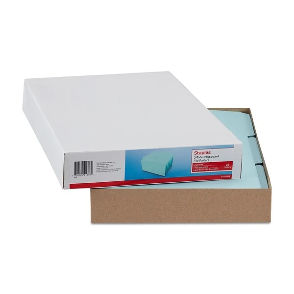 Give official documents a professional filing solution with these pressboard files. Durable construction resists the rigors of regular use, and the 1/3-cut tab layout provides ample space for customized subject labels. Each folder accepts legal-size documents, keeping critical paperwork protected from page loss and accidental damage. Showcasing a bold hue, these Staples legal-size light blue pressboard file folders make it easy to add a color-coding element to cabinet drawers.