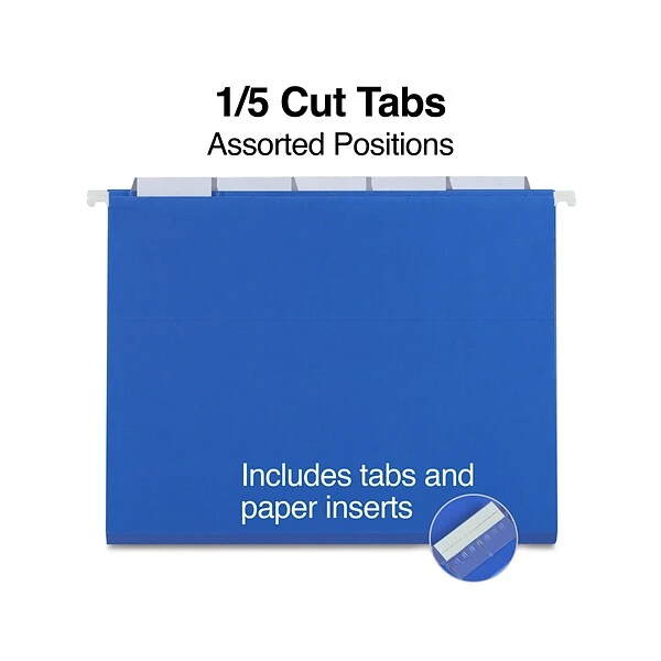 Keep paperwork in order with this 25-count box of blue hanging file folders. Plastic markers let you place the tabs in five different positions for simple organization, and paper inserts allow customized labels for easy document identification. The coated hangers on this Staples five-tab letter-size blue hanging file folder move smoothly along file drawer rails for quick access.