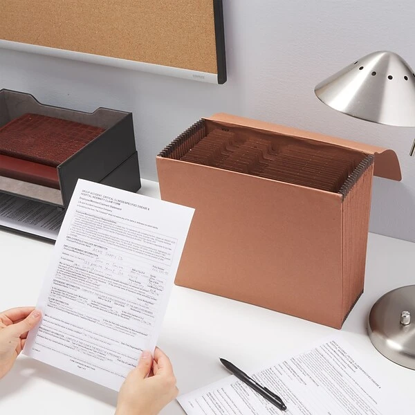Manage paperwork inside this brown expanding file folder. With 21 pockets labeled A to Z, indexing letter-size documents for quick access is easy. A top flap and an elastic string closure keep papers in place during transport, and the durable gusset expands to accommodate thick files. This Staples letter-size heavy-duty expanding wallet features tear-resistant redrope material for extra protection and long-term use.