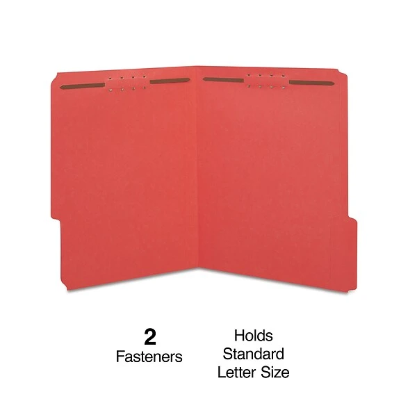 Keep paperwork safe from damage with these fastener folders. The letter-size dimensions are ideal for commonly used office documents, while the reinforced tabs help create an organized filing system for effortless access. Boasting a sturdy paper stock construction, these Staples letter-size red reinforced-tab fastener folders are durable to handle daily use, and the 50-count box provides an ample supply for busy environments.