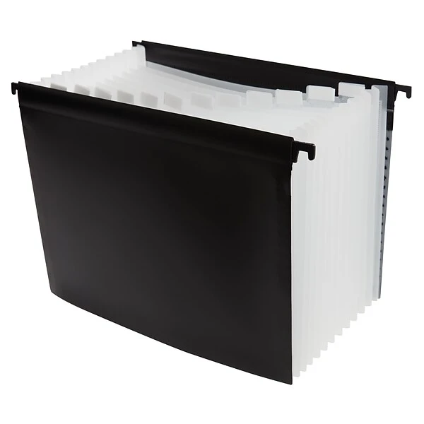 Sort documents by date with this expanding hanging file folder. The 12 pockets are labeled January through December for simple sorting, and the durable poly construction resists wear and tear for long-lasting use. Coated hangers glide smoothly on file guides for easy setup. This TRU RED 12-pocket black poly expanding hanging file folder accepts standard pages for added protection and convenient organization options.