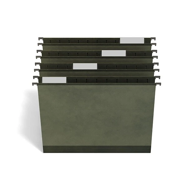 Allocate a secure place for your legal-size contracts, documents and important copies with these hanging file folders. The extended hooks and reinforced top and bottom edges offer stability and easy placement on rails, while the lighter color on the inside of the folder offers contrast to help prevent misfiles. These TRU RED™ legal-size standard green hanging file folders coordinate with the rest of the Business Essentials range to create a cohesive look for your document organization system.