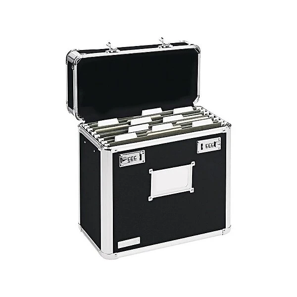 Take files wherever they are needed by storing them in this letter-size black locking file tote. The internal rails are sized for hanging letter-size file folders, while the chrome steel corners and aluminum construction offer durability. This Vaultz locking file tote is HIPAA compliant and features a label holder on the front for inserting a business card or other label.