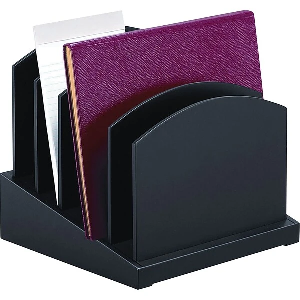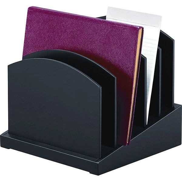 The Victor Midnight Black Collection brings a fresh perspective to desk accessories by offering functional solutions with appealing design elements. The 8601-5 Incline File provides five full-sized file slots to hold files, letters, notebooks, and papers. Removable dividers allow you to adjust the slot sizes. Features sturdy 4.6 lb. wood construction with a durable double coated matte black finish. Non-slip rubber feet reduce movement and protect your work surface from scratches and scuffs. Stylish 9.5” x 9.63” x 8.75” design makes a great addition to any desk. Perfect for use either at home or in the office.